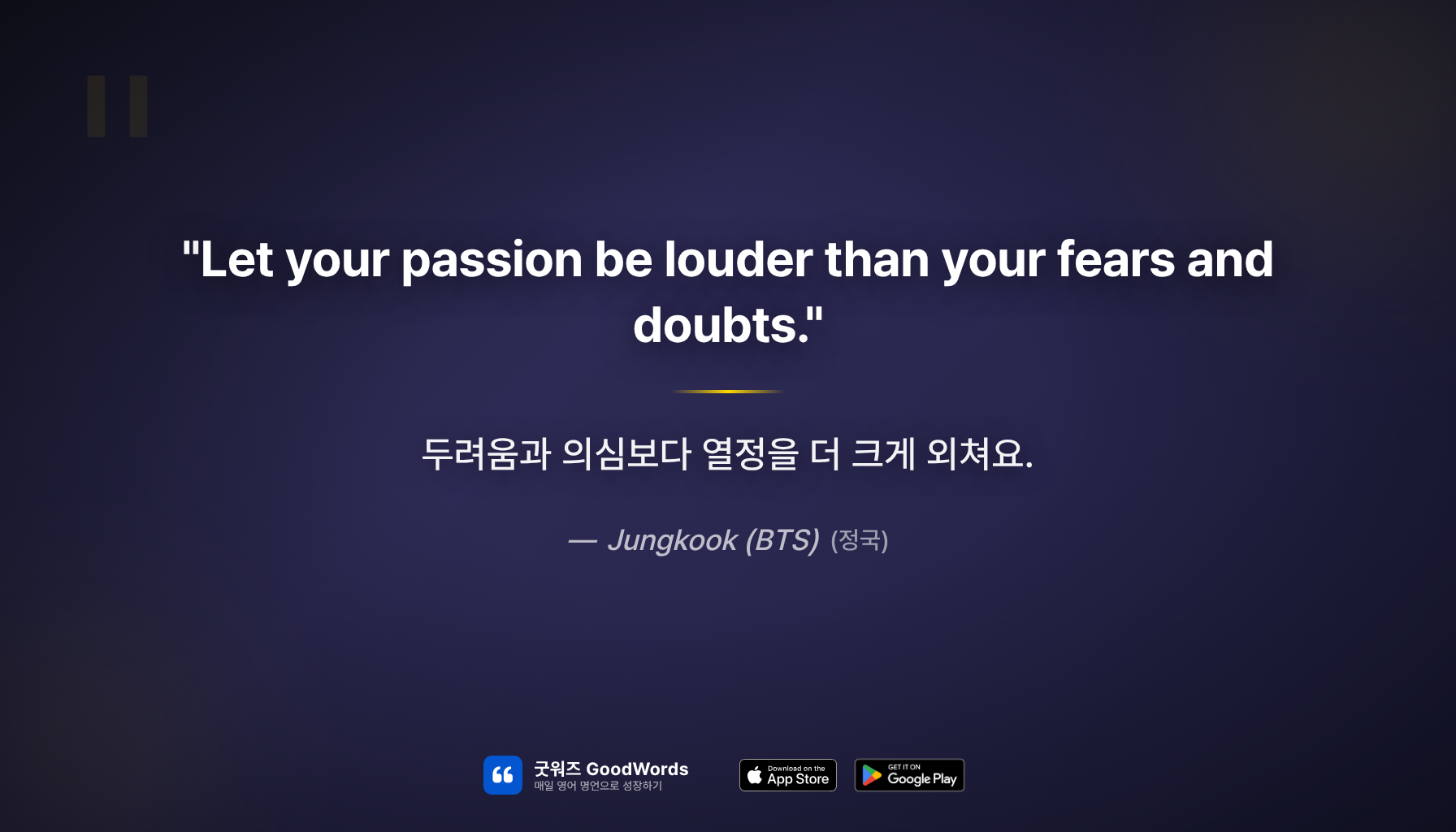 정국의 이 명언이 여러분의 하루에 작은 변화를 가져다주길 바랍니다. 완벽한 준비를 기다리기보다, 지금 이 순간부터 실천해보세요. GoodWords 앱에서 매일 새로운 명언을 만나보세요!